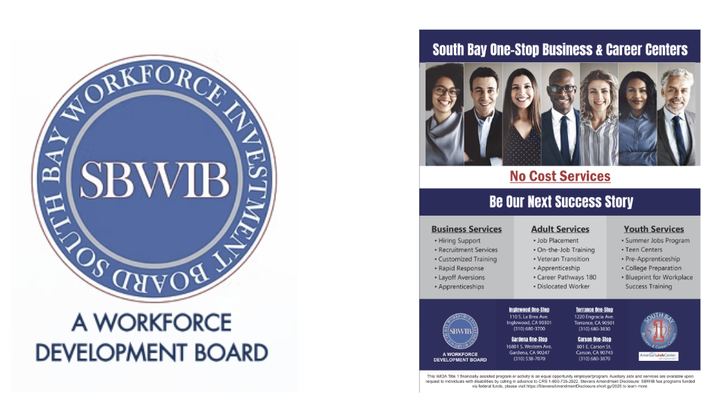 The SBCCOG partners with the South Bay Workforce Investment Board (SBWIB) to connect businesses with workforce development programs, business support services and opportunities. The SBWIB helps employers build a skilled workforce while creating pathways for individuals to prepare for and access quality careers.