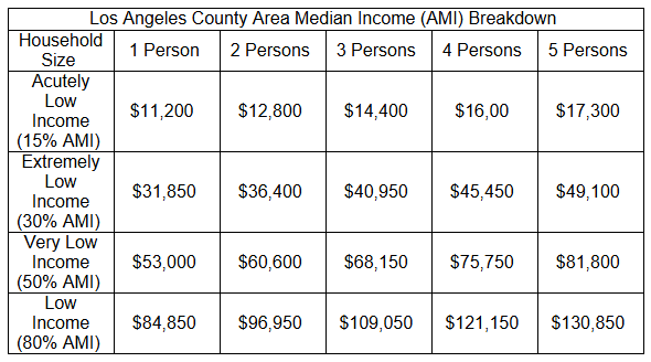 - Have an annual gross income that is at or below 80% of the Los Angeles County area median income (AMI). (Priority will be given to households/persons at or below 50% AMI.