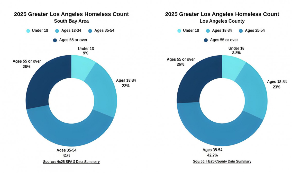 According to the Los Angeles Homeless Services Authority (LAHSA), the 2025 Greater Los Angeles Homeless Count data reports 26% of the total homeless population in LA County is age 55 and over. In the South Bay region, the report shows this percentage is higher, with adults aged 55 and over comprising 28% of the total homeless population.